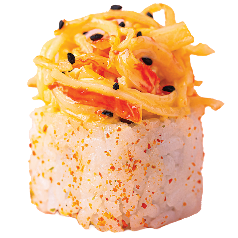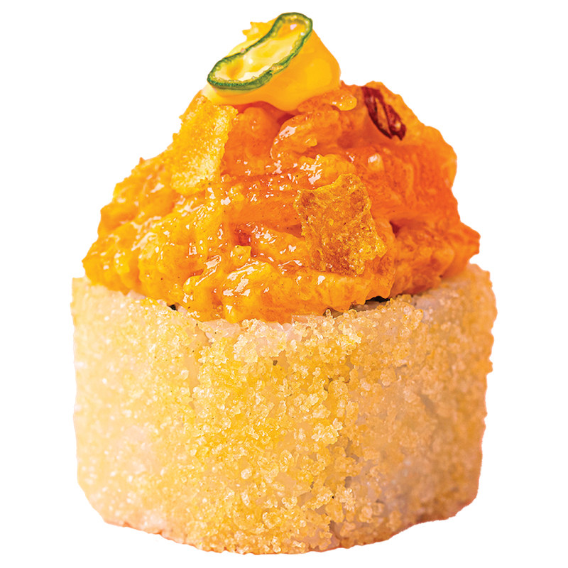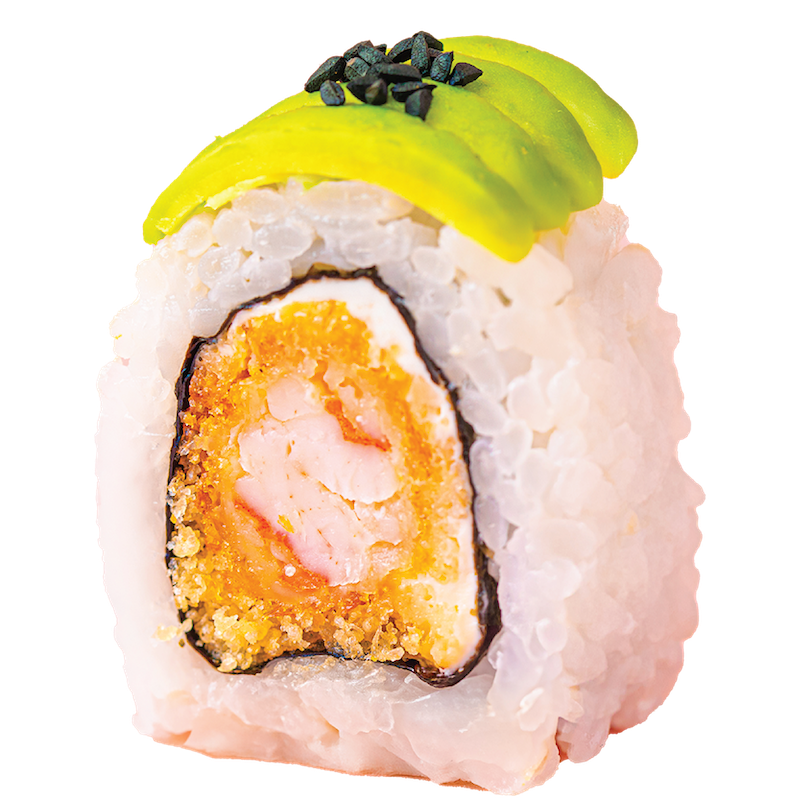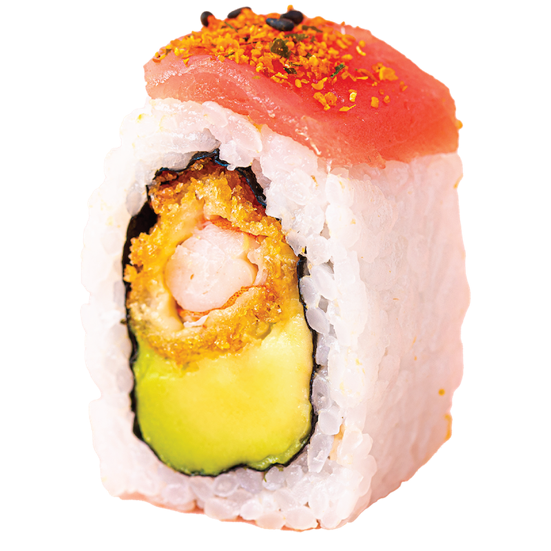 Sushi rice, nori, fresh avocado, shrimp tempura, crispy tempura, crab, spicy mayo, ponzu, hon Dashi, shichimi Togarashi (6 Pcs).