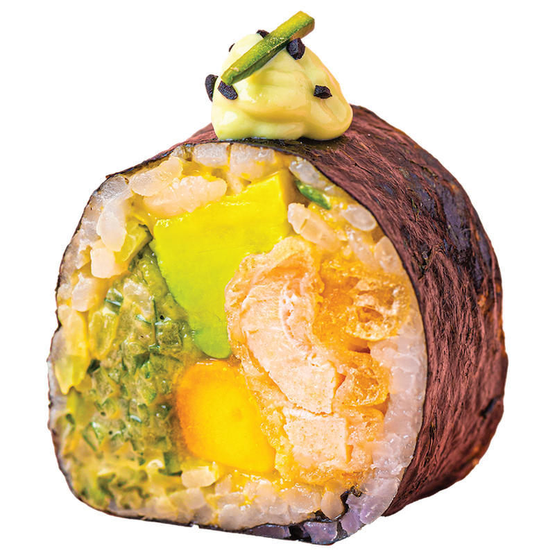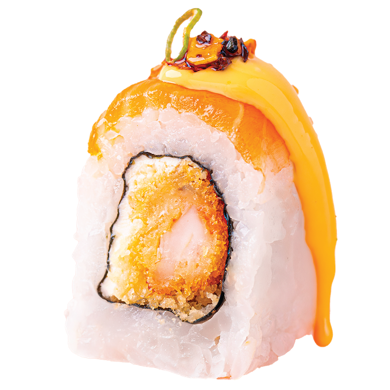 Sushi rice, nori, fresh avocado, salmon tempura, avocado mayo, mango, cucumber, black sesame, mango puree (10 Pcs).